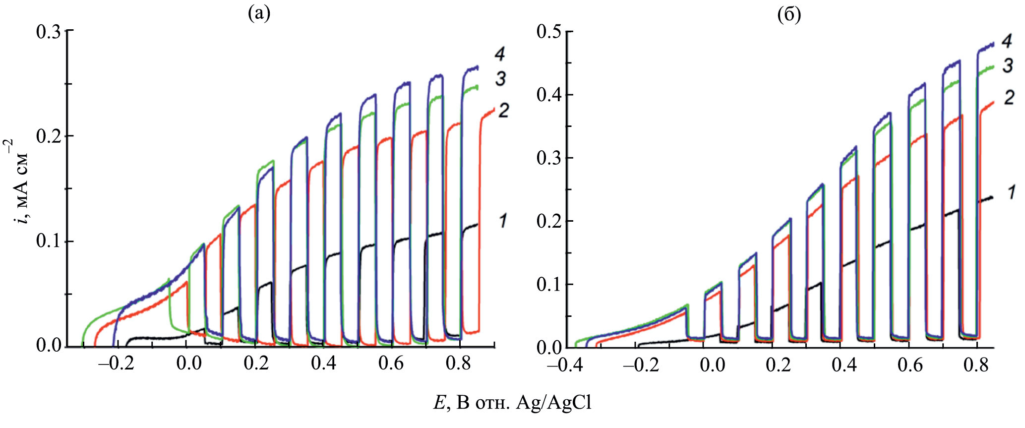 Рис. 3. Вольтамограммы пленочных фотоанодов WO3(25 мин)/FTO (а) и WO3(50 мин)/FTO (б), полученные в темновых условиях и при освещении видимым светом с плотностью мощности 100 мВт cм−2 в водных растворах: (1) 0.5 M Na2SO4; (2) 0.5 M Na2SO4 + 20% CH3OH; (3) 0.5 M Na2SO4 + 20% C2H4(OH)2; и (4) 0.5 M Na2SO4 + 20% C3H5(OH)3. Скорость сканирования потенциала 10 мВс–1.