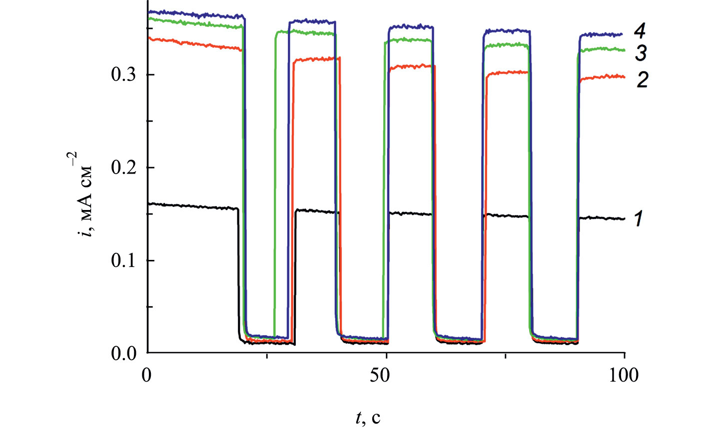 Рис. 4. Транзиенты фототоков, полученные при потенциале E = 0.6 В отн. Ag/AgCl пленочного фотоанода WO3(50 мин)/FTO в темновых условиях и при освещении видимым светом с плотностью мощности 100 мВт cм−2 в водных растворах: (1) 0.5 M Na2SO4; (2) 0.5 M Na2SO4 + 20% CH3OH; (3) 0.5 M Na2SO4 + 20% C2H4(OH)2; и (4) 0.5 M Na2SO4 + 20% C3H5(OH)3.
