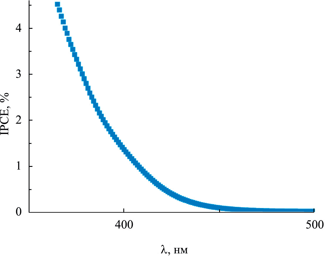 На рис. 5 представлена зависимость эффективности преобразования падающего фотона в ток (IPCE%) от длины волны монохроматического света (λ) для WO3(50 мин)/FTO в растворе 0.5 M Na2SO4 + 20% C3H5(OH)3. Видно, что фототок генерируется видимым светом с длиной волны 390–450 нм. При длинах волн выше 450 нм фотоактивность WO3(50 мин)/FTO отсутствует. IPCE% (λ) образца WO3(50 мин)/FTO хорошо коррелирует с его кривой поглощения (рис. 2а). Расширение фотоактивности в сторону больших длин волн возможно путем модификации поверхности пленки WO3 различными промотирующими добавками. Такие системы в дальнейшем планируется синтезировать и исследовать с целью повышения эффективности фотоэлектроокисления ряда органических деполяризаторов.