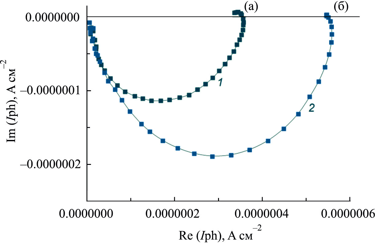 Изменение природы деполяризатора влияет на величину фототока как через изменение константы скорости рекомбинации, так и через изменение константы скорости окисления деполяризатора. На рис. 6 фототок при отсутствии рекомбинационных потерь характеризуется точкой пересечения IMPS c осью Х (точки а и б). Из рис. 6 видно, что значение этого фототока значительно растет при переходе от фонового электролита (точка а) к раствору 0.5 M Na2SO4 + 20% C3H5(OH)3 (точка б). Это указывает на более высокую константу скорости фотоэлектроокисления C3H5(OH)3 по сравнению с водой. В 20% растворах молярная концентрация спиртов быстро снижается при переходе от MeOH к C2H2(OH)2 и далее к C3H5(OH)3, что могло приводить к снижению плотности фототока. Наблюдаемый на рис. 3 рост плотности фототока в последовательности MeOH < C2H2(OH)2 < C3H5(OH)3 можно связать только с ростом в той же последовательности константы их скорости окисления. Такой результат можно объяснить увеличением количества адсорбционных мест на поверхности фотоанода по мере увеличения количества OH-групп в молекуле спирта.