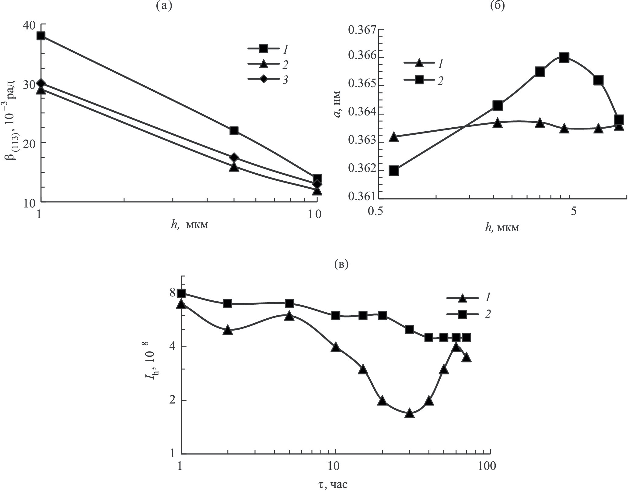 Рис. 1. Характеристики пары трения бронза БрА5–сталь45: 1 – трение в среде М9С; 2 – трение в среде М9С + 12-LioSt; 3 – до трения. (а) – изменение физического уширения рентгеновских линий β(311) по глубине зоны контактной деформации h в установившемся режиме (τ = 30 час); (б) – изменение периода а кристаллической решетки α-твердого раствора Cu–Al (бронза БрА5) по глубине зоны контактной деформации h после трения в установившемся режиме; (в) – зависимость интенсивности изнашивания Ih бронзы от времени испытаний τ. (Среднеквадратичные ошибки измерений не превышают размеры точек на графиках.).