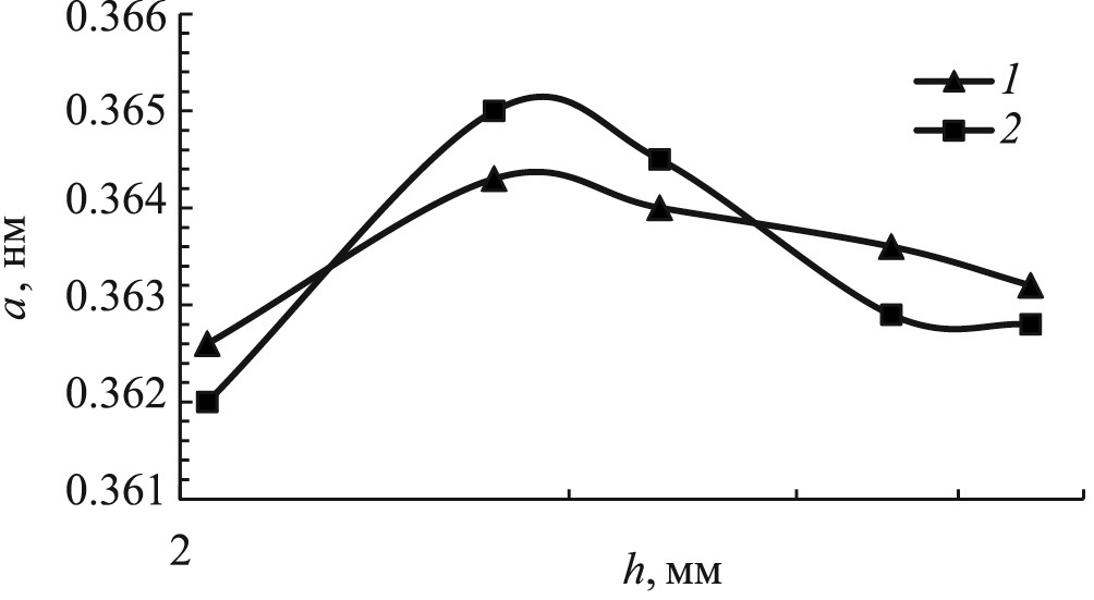 Рис. 1б иллюстрирует распределения значений периода кристаллической решетки α-твердого раствора а по глубине h приповерхностного слоя тех же трибообразцов. Напомним, что для твердых растворов замещения выполняется закон Вегарда: аАВ = САаА + (1 – СА)аВ, где аАВ, аА и аВ – параметры решеток раствора, растворителя и растворенного элемента соответственно; СА, ат% – атомная концентрация растворителя в сплаве [13]. Поэтому изменение величины аАВ позволяет анализировать диффузионное перераспределение легирующих элементов в зоне механического или любого другого воздействия на сплав.