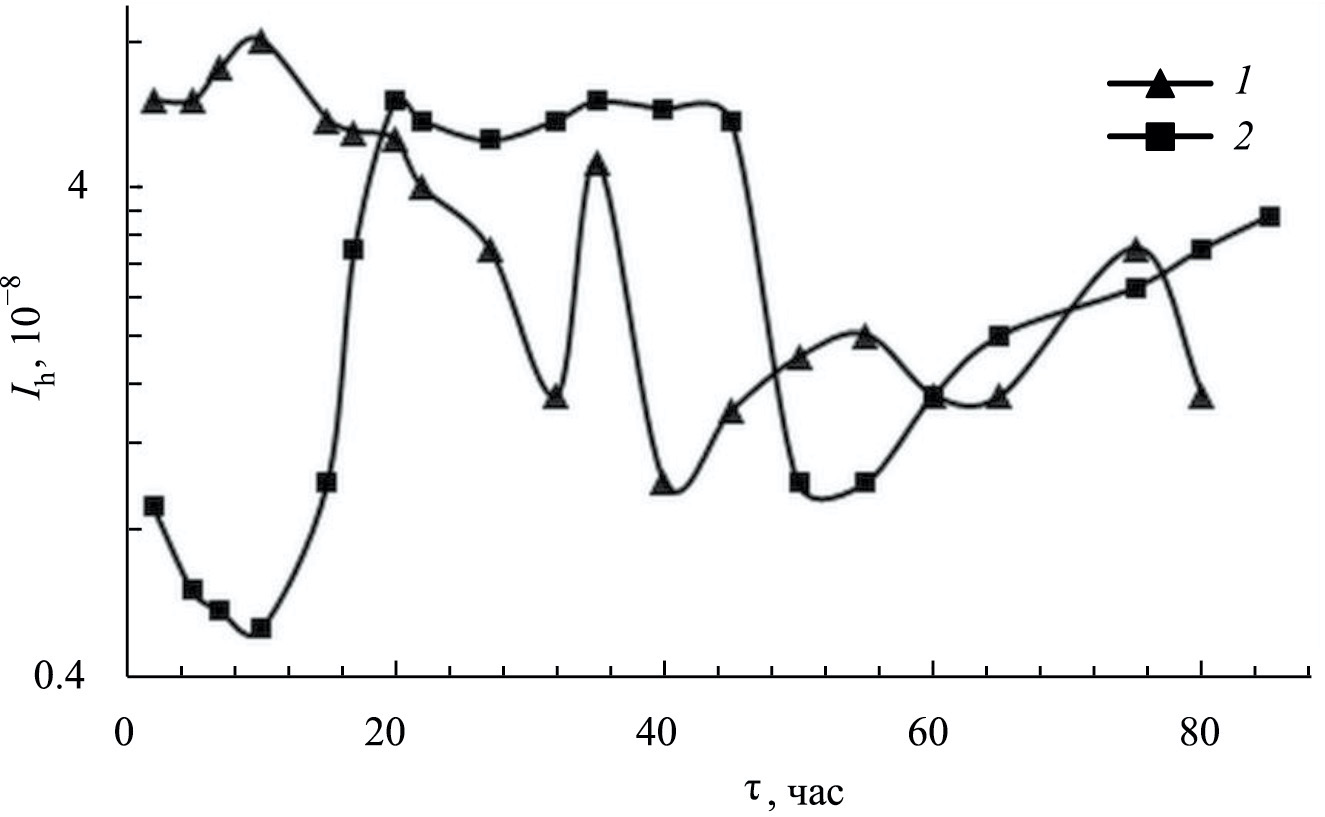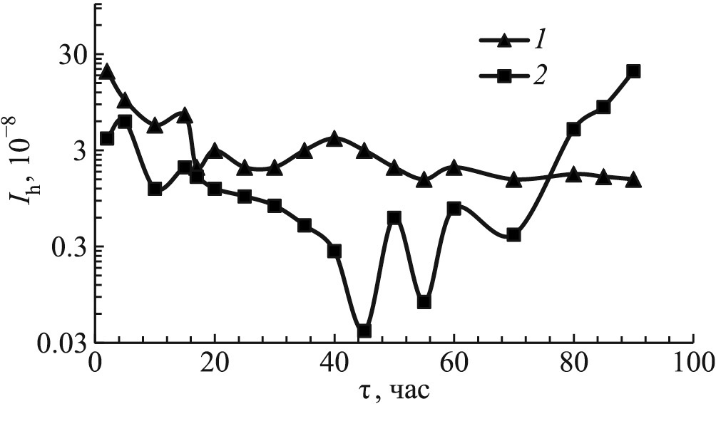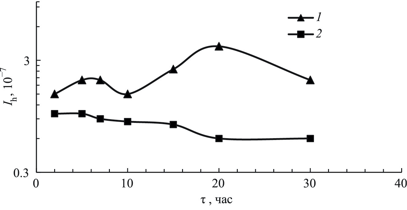 Рис. 7. Зависимость интенсивности изнашивания Ih бронзы БрА5 от времени испытания τ при трении в смеси М9С + ДЭБЯК – 1; в смеси М9С + ДЭБЯК + 12-LioSt – 2.