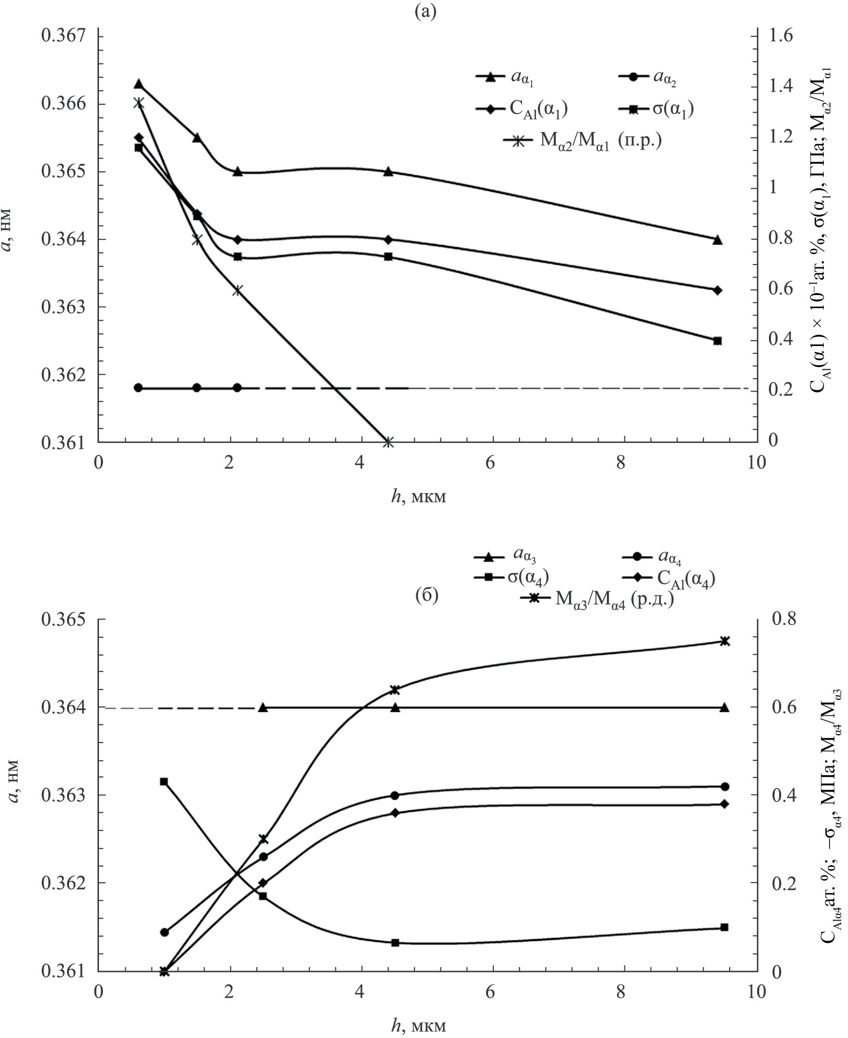 Рис. 5. Изменения периодов аαi кристаллической решетки фаз α1, α2, α3 и α4, а также концентраций атомов Al (СAlαi), остаточных внутренних напряжений σαi, относительных масс Mα2/Mα1 (последние определены по правилу рычага) и Mα3/Mα4 (определены по рентгеновским данным) структурных составляющих модифицированной зоны по ее толщине h при испытаниях в смазочной среде чистого ДЭБЯК – (а); при испытаниях в композиционной среде ДЭБЯК + 12-LioSt – (б).