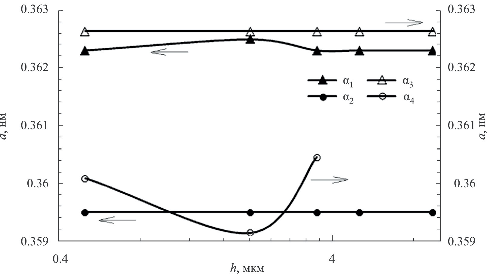 Рис. 6. Изменение периода кристаллической решетки а фаз α1–α4 в поверхностном слое по его толщине h: α1, α2 – испытания в среде М9С + ДЭБЯК; α3, α4 – в среде М9С + ДЭБЯК + 12-LioSt.