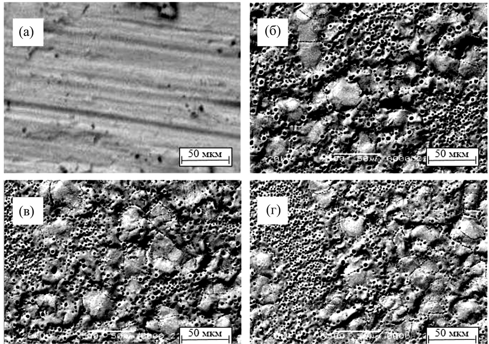 Рис. 1. СЭМ изображения поверхности титана ВТ1-0 до (а) и после ПЭО (б–г). Анодная плотность тока импульсов, А/дм2: б – 15; в – 30; г – 60.