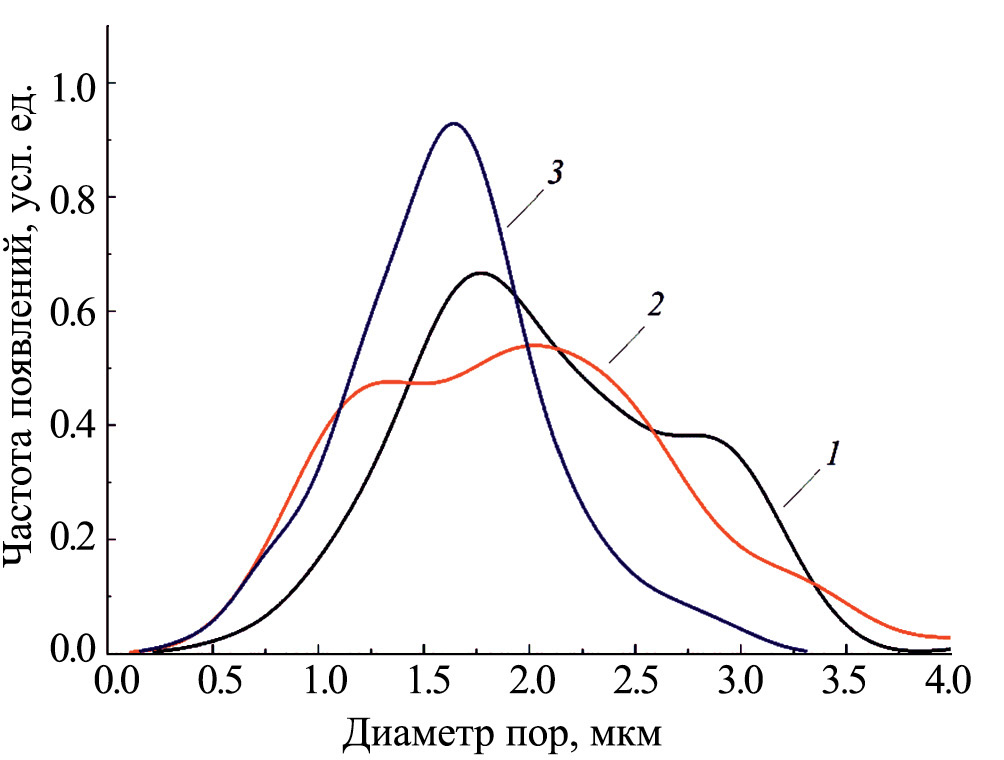 Рис. 2. Дифференциальные кривые распределения пор по диаметрам в сформированных покрытиях в зависимости от анодной плотности тока импульса ПЭО. Анодная плотность тока импульса ПЭО, А/дм2: 1 – 15; 2 – 30; 3 – 60.
