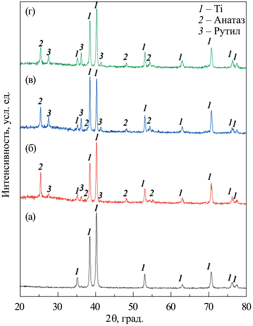 Рис. 4. Дифрактограммы титана ВТ1-0 до (а) и после ПЭО (б–г). Анодная плотность тока импульсов ПЭО, А/дм2: б – 15; в – 30; г – 60.