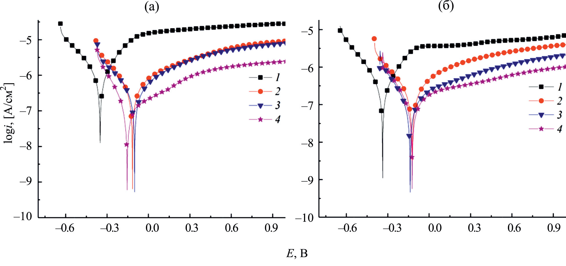 Рис. 5. Поляризационные кривые исходных образцов титана ВТ1-0 (кривая 1) и после ПЭО (кривая 2–4) в растворах Хэнкса (а) и искусственной слюны (б). Анодная плотность тока импульса ПЭО, А/дм2: 2 – 15; 3 – 30; 4 – 60.