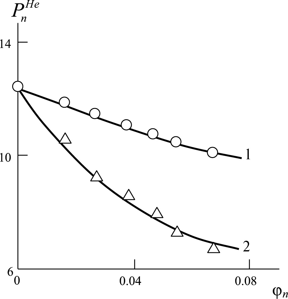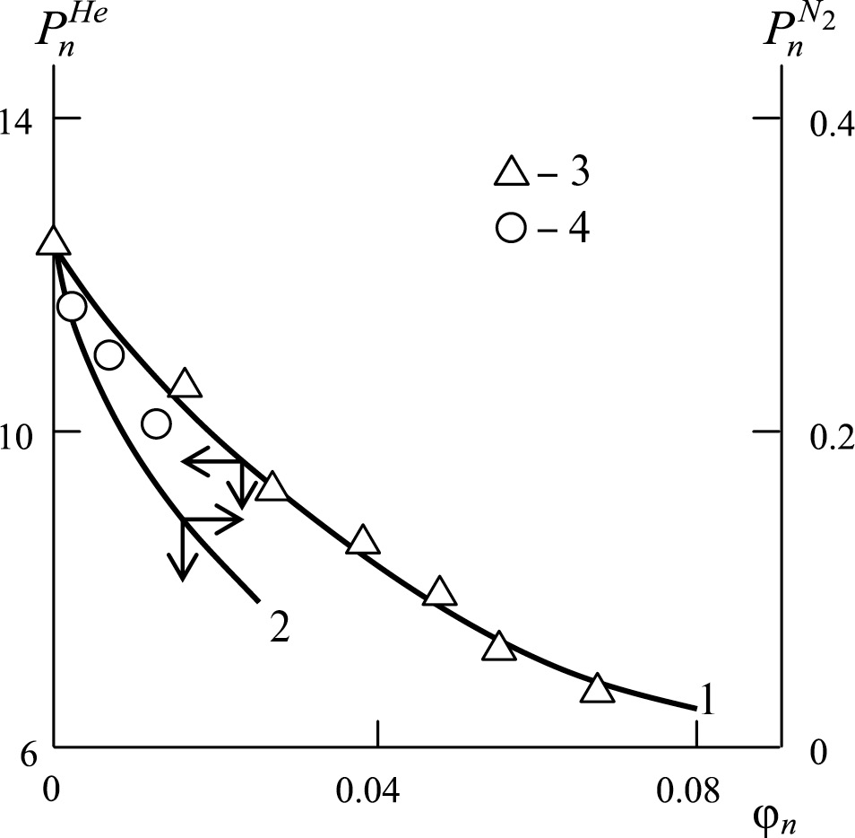 На рис. 1 приведено сравнение полученных экспериментально [6] и рассчитанных согласно предложенной модели (уравнения (1)–(3)) зависимостей коэффициентов газопроницаемости по азоту и гелию от объемного содержания нанонаполнителя для нанокомпозитов ПК/Гр. Величину определяли согласно хорошо известной формуле [10]: