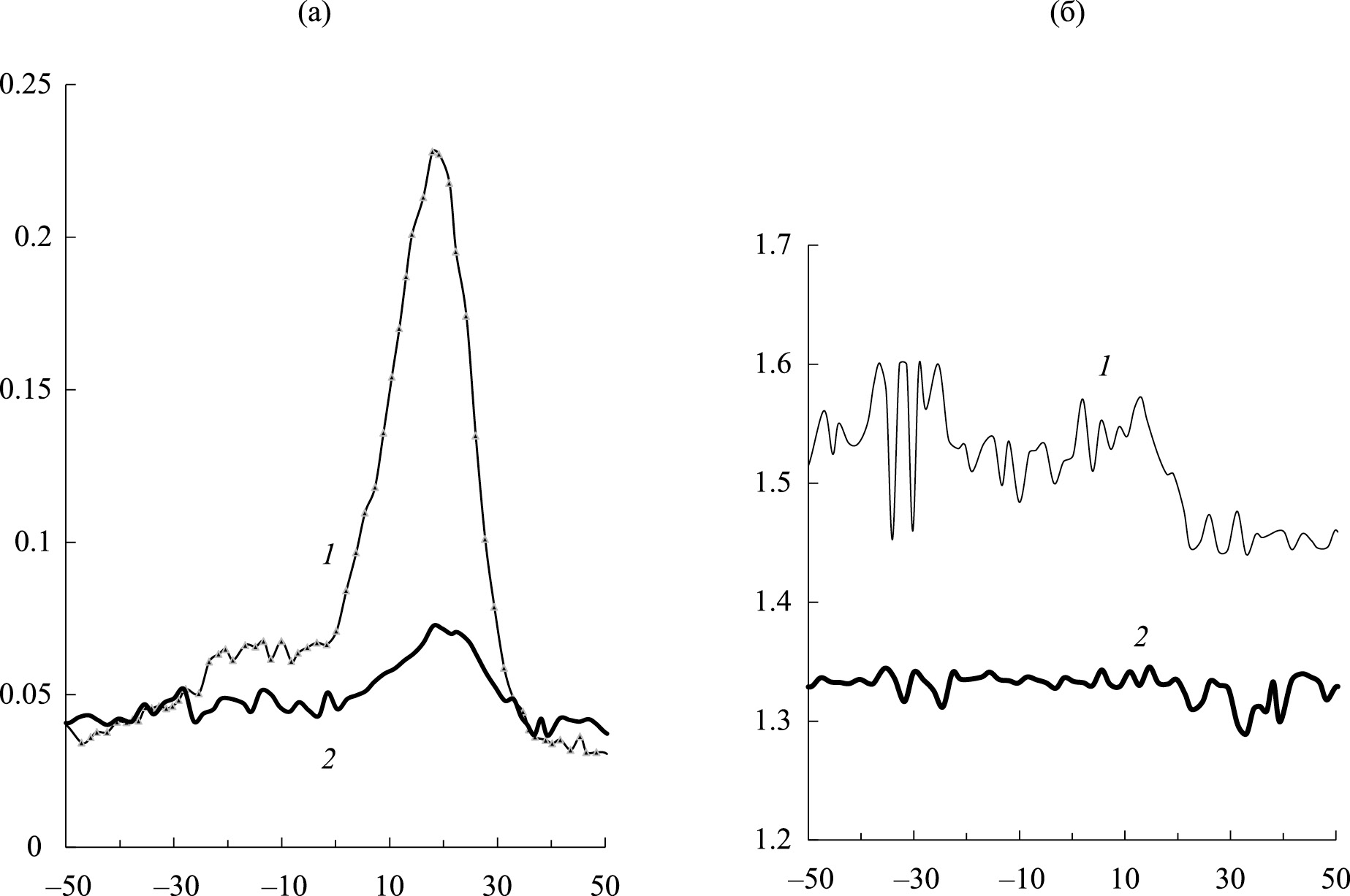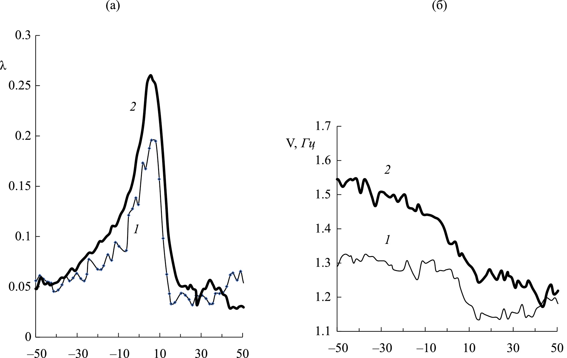 Рис. 1. Диссипативные процессы и частота колебаний в пленках (а, б): кривые 1 – без модификатора; кривые 2 – с модификатором.