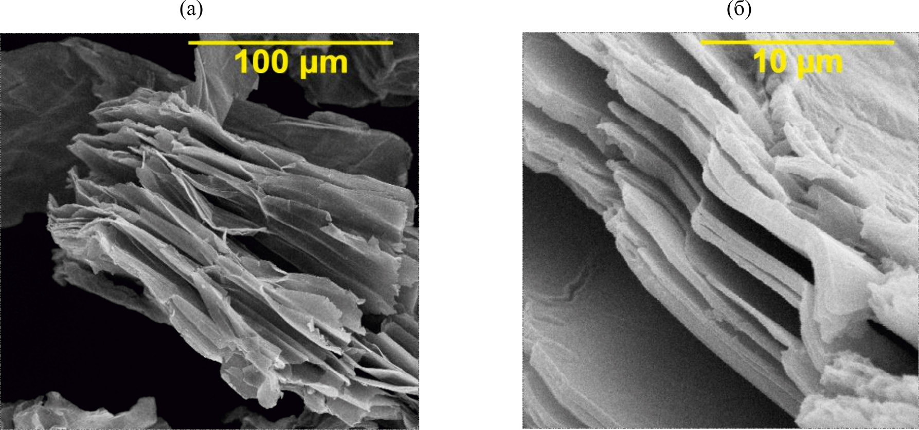 Рис. 1. СЭМ-изображения структуры оксида графена. Увеличение ×1000 (а), ×10000 (б).