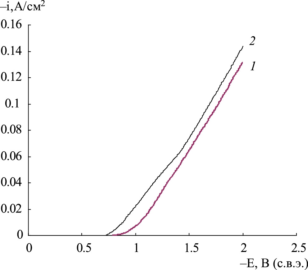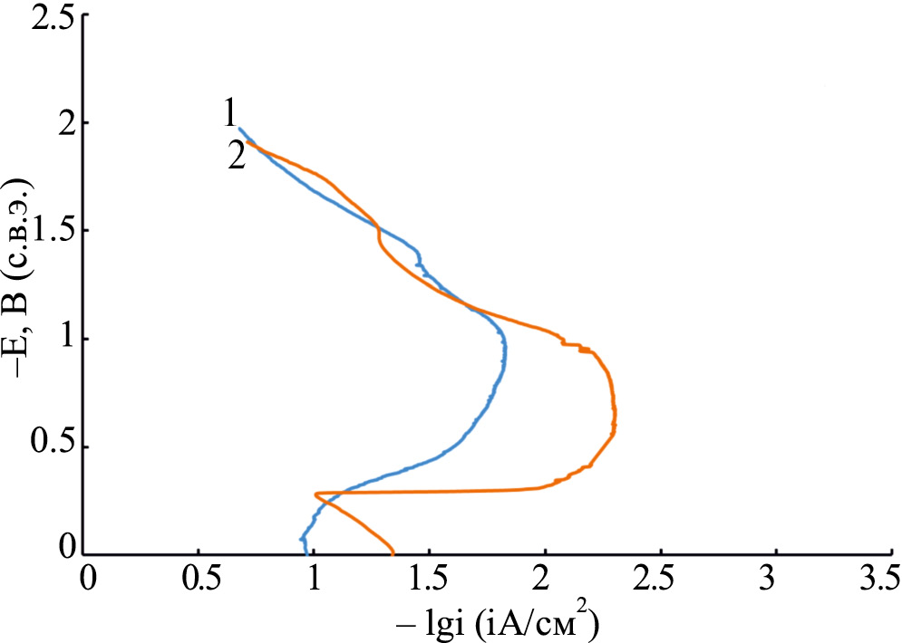 Рис. 5. Потенциодинамические поляризационные кривые никеля (1) и КЭП никель–ОГ (2) в 0,5 М Н2SO4 (покрытия получены при катодной плотности тока ik = 10 А/дм2).