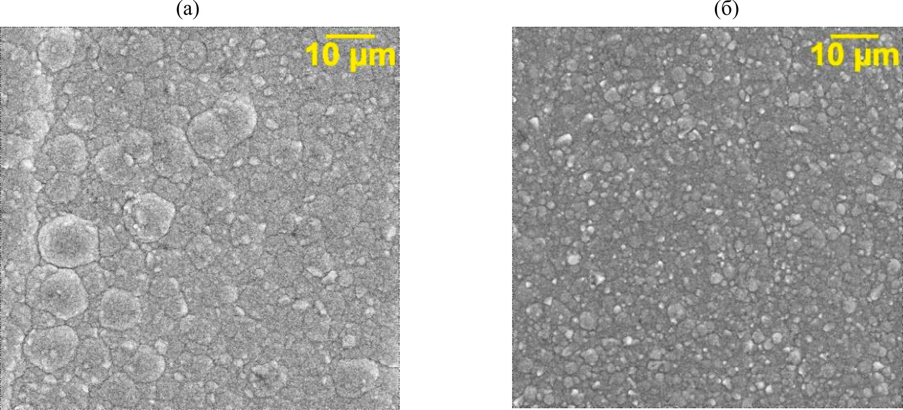 Рис. 4. СЭМ–изображения поверхности никеля (а) и КЭП никель–ОГ (б), полученных при катодной плотности тока ik = 10 А/дм2. Увеличение ×2500.