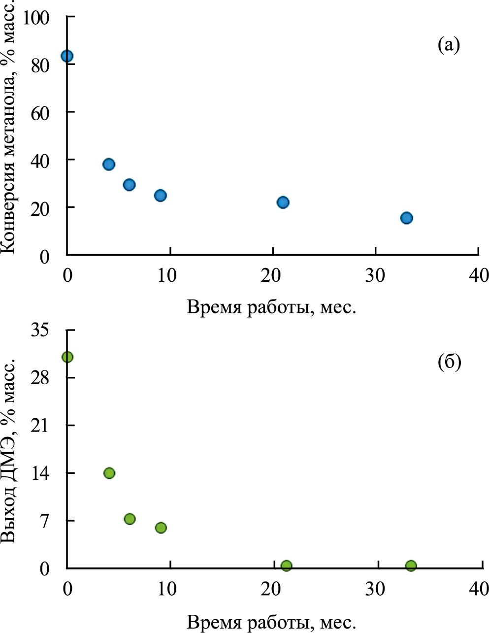 Зависимости конверсии метанола и выхода ДМЭ от времени эксплуатации наиболее эффективного адсорбента АСМ на УПГТ изучали в интервале 120°–290°С при скорости насыщенного метанолом потока азота 1200 мл/мин с концентрацией метанола 197 ± 3 мг/л и при атмосферном давлении (рис. 1). В процессе эксплуатации на промышленной установке удельная поверхность и удельный объем пор адсорбентов снижались с 697 (исходный) до 505 (отработавший 33 месяца) м2/г и с 0.33 (исходный) до 0.28 (отработавший 33 месяца) см3/г при постоянстве фазового состава (табл. 5). Уменьшение удельной поверхности снижало каталитическую активность адсорбентов (рис. 1), что связано, по-видимому, с уменьшением количества связанных с алюминием поверхностных гидроксильных групп [27].