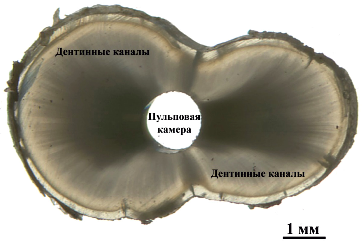 Твердая основа зубов человека дентин является иерархически организованной структурой биологического происхождения: дентинная матрица пронизана каналами, идущими по нормали от пульповой камеры к границам дентина с эмалью и с цементом (рис. 1) [1–3]. В зависимости от расположения в зубе и возраста пациента, диаметр каналов составляет 1 ÷ 3 мкм, а расстояние между соседними каналами – около 10 мкм. Внутри каналов циркулирует дентинная жидкость, по химическому составу близкая к ротовой жидкости [4]. Дентинная матрица заполнена сеткой коллагеновых волокон толщиной 3 ÷ 5 мкм и упрочнена плоскими гексагональными кристаллами гидроксиапатита кальция размером 30 ÷ 40 нм [5]. По массе дентин интактных зубов человека состоит на 30% из биоорганических и на 45% из неорганических соединений [6]. Оставшиеся 25% объема занимает вода, которая содержится в дентинных каналах (~75%) и химически связана внутри дентина (~25%) [7, 8]. Поэтому состояние дентина, когда дентинные каналы заполнены водной средой и / или данная твердая ткань гидрирована, следует считать его естественным состоянием [9]. Благодаря иерархическому строению и сложному биохимическому составу, дентин зубов человека способен выдерживать значительную упругую и необратимую деформацию при достаточно больших нагрузках, а также демонстрировать высокое сопротивление росту трещины [10].