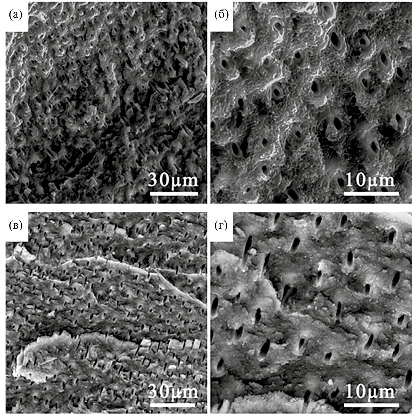Рис. 3. Поверхности изломов образцов дентина толщиной 0,75 мм при срезе: (а), (б) – после выдержки в воде в течение 24 часов; (в), (г) – после приготовления.