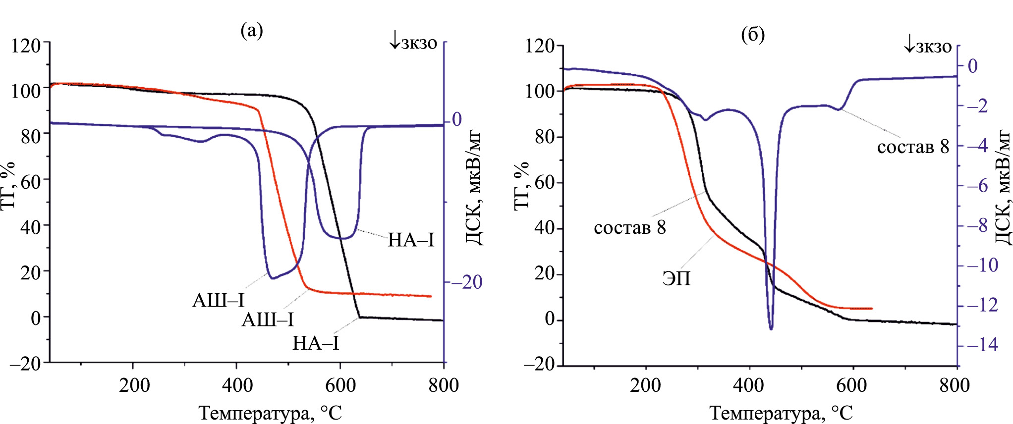 Кривые термогравиметрического анализа (ТГ) и дифференциальной сканирующей калориметрии (ДСК) были сняты на установке синхронного термоанализатора Netzsch STA 449 С в интервале температур 40°–800°С со скоростью нагрева 20°С/мин в динамической атмосфере воздуха (поток воздуха 50 мл/мин).