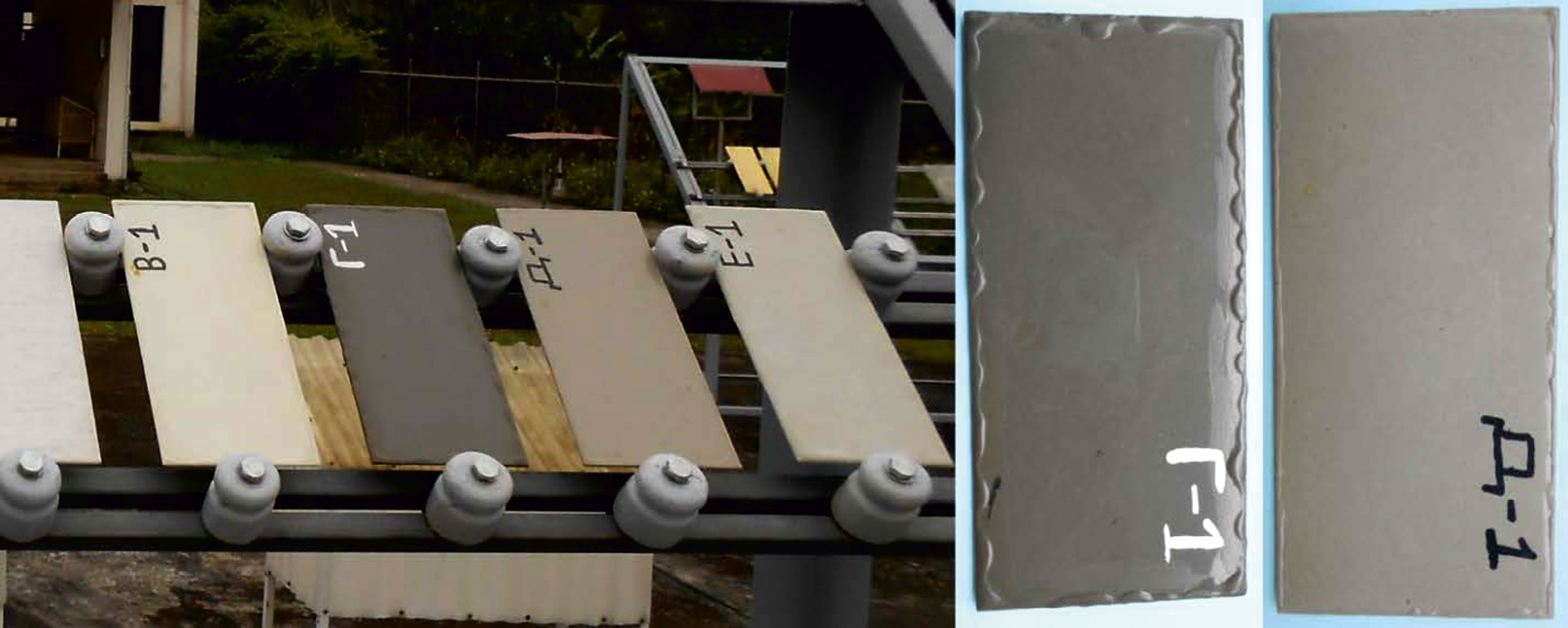 Для изучения устойчивости к атмосферной коррозии покрытия составов 6 и 12 (табл. 2) были нанесены на стальные (сталь 08ПС, 70×150×0.9 мм) пластины. Испытания проводились в головном (КИС Хоа Лак, г. Ханой) отделении Совместного Российско-Вьетнамского Тропического научно-исследовательского и технологического центра. Пластины были установлены на открытой бетонной площадке под углом 45° к горизонту. Период экспозиции образцов составил 2 мес. (декабрь 2022 г. по февраль 2023 г.). Атмосферные параметры, г. Ханой: средняя температура воздуха – 14.6°–24.1°С, средняя относительная влажность – 85.3–100%.