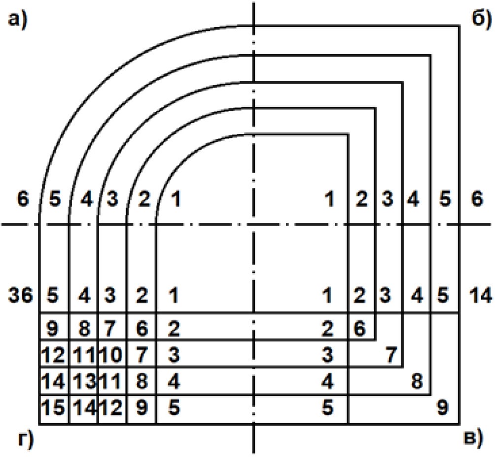 На рис. 1 показаны примеры разбиения переходной области капли с κ = 6 на типы на плоскости: а) на круге (показано сечение сферы через ее центр) и б)–г) для квадрата (показано сечение куба по центру его четырех граней): б) угол кубической части системы из прямых монослоев, в) выделение вершин в углах всех монослоев, г) распределенное множество узлов в узлах), соответственно. Области, в которых располагаются узлы одного типа, отделены друг от друга сплошными линиями. (Следует также учесть схематический характер двумерного рисунка для объемных угловых областей.)