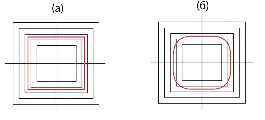 Рис. 2. Схема формы разделяющей поверхности в сечении переходной области фазы кубической формы: (а) строго кубической формы и (б) сглаженной формы.