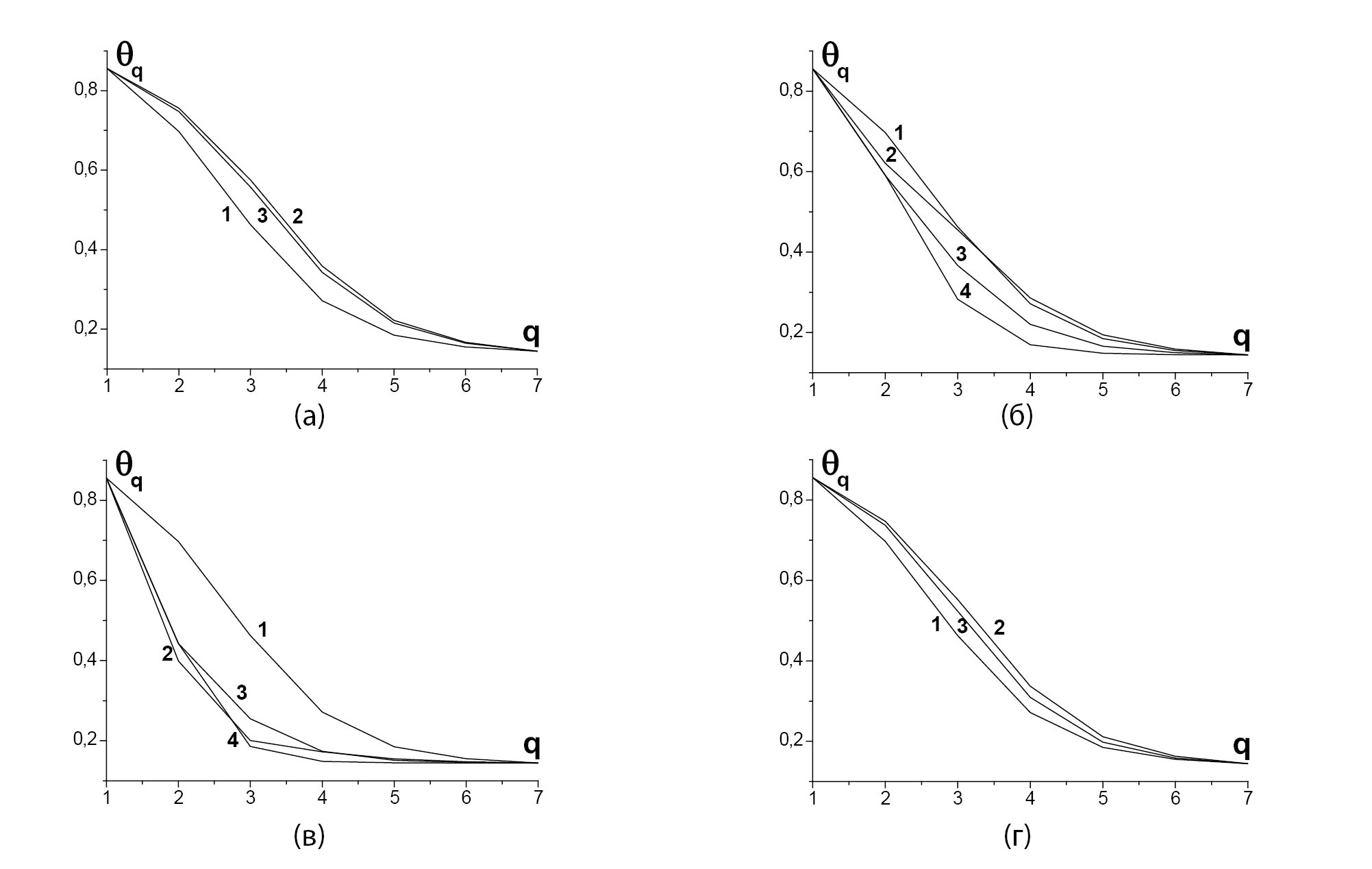 Рис. 3. Сравнение концентрационных профилей в моделях куба (б) (кривая 1), (в) (2) и (г) (кривые 3 и 4) отдельно для граней куба (поле а), его ребер (поле б), вершин (поле в) и усредненные по всем областям (поле г).