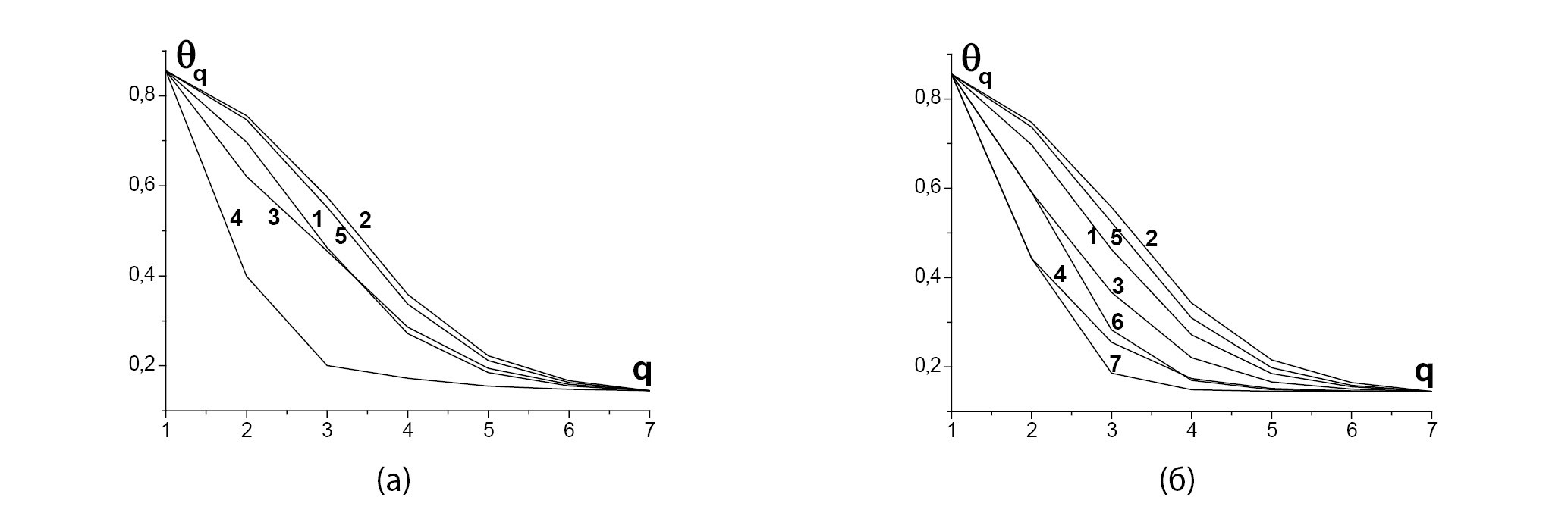 Рис. 4. Сравнение концентрационных профилей усредненных по всем областям (1, 5), на гранях куба (2), усредненные по ребру (3), усредненные по вершине (4), локальные по диагонали ребра (6) и локальные по диагонали вершины (7 – только на поле б) в модели куба б) (кривая 1 на полях а и б), в) (кривые 2–5 на поле а) и г) (кривые 2–7 на поле б).