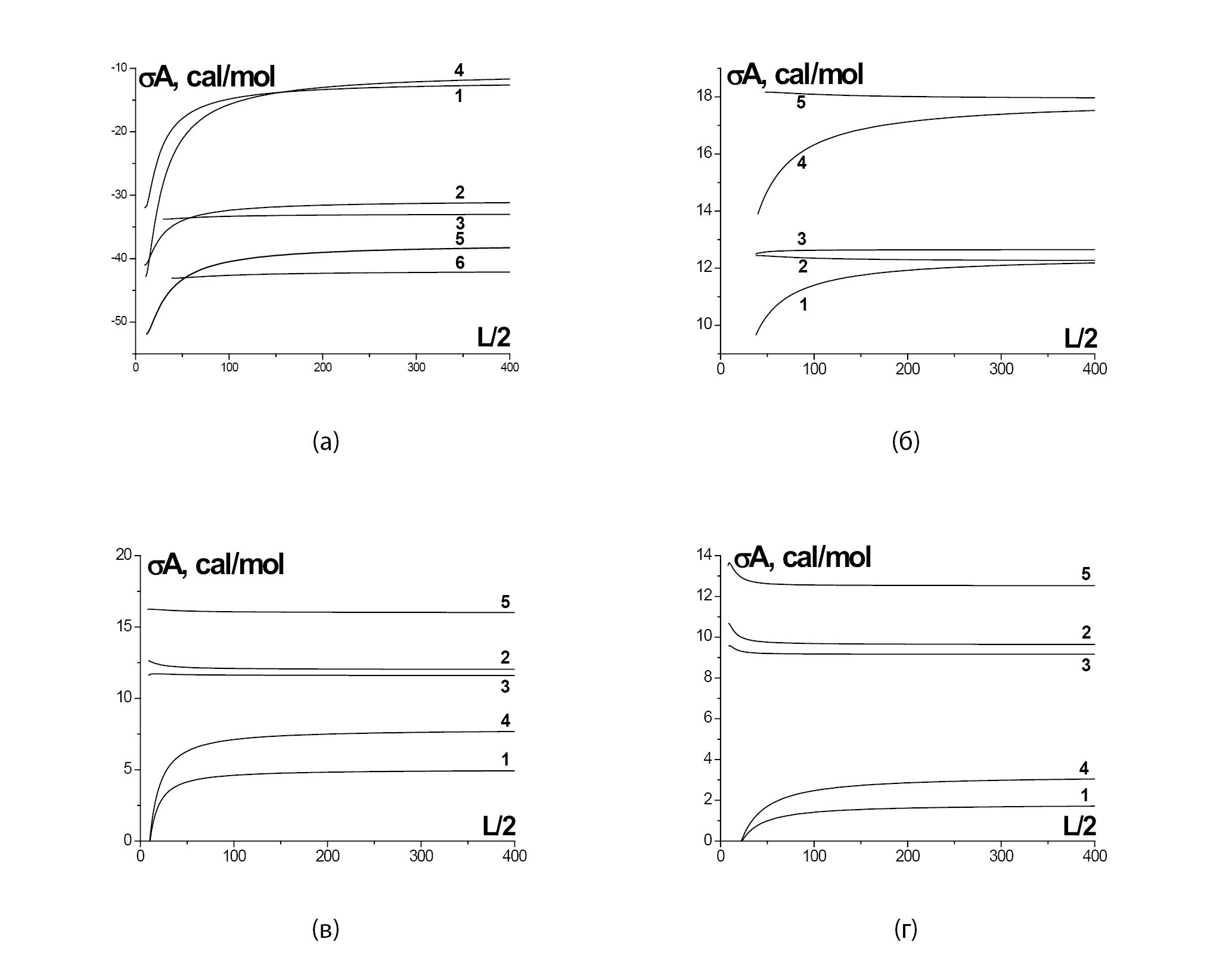 Согласно рис. 7б основные результаты показывают уменьшение ПН(L) с уменьшением размера L, т.е. производная от ПН по размеру домена положительна. Это показывает, что термодинамический анализ [19] является недостаточно корректным. В работе [19] оговаривается, то причиной этого может быть допущение о неизменности локальных величин ПН от размера домена. Микроскопический анализ показывает, что существует ряд причин для отрицательных производных dσ(L)/dL: 1) случай неравновесия – отсутствие учёта механических характеристик системы при определении ПН; 2) некорректный подсчет среднего ПН (у нас это на примере среднего ПН по области вершины или ребра в модели г)); 3) неточное определение положения разделяющей поверхности с варьированием размера фазы. МРГ дает такие величины для локальных ПН, но не для средних ПН по всей переходной области. С уменьшением размера кубического домена возрастает доля участком поверхности с искривлением, а на поверхности, которая сжимается вокруг плотной фазы, ПН ниже там, где меньше радиус кривизны, т.е. соблюдаются неравенства: ПН(вершина) < ПН(ребро) < ПН(грань). В итоге, даже если по тем или иным причинам где-то локально ПН будет расти с уменьшением размера, то взвешивание по всем областям должно дать убывание среднего ПН с уменьшением размера фазы. Ошибка также может состоять, в том числе, и в неправильном определении локальных ПН, так что нарушаются неравенства ПН(вершина) < ПН(ребро) < ПН(грань). Но преобладающим всегда является вклад от граней (а не вершин и ребер), так как именно от граней идёт основной вклад в ПН.