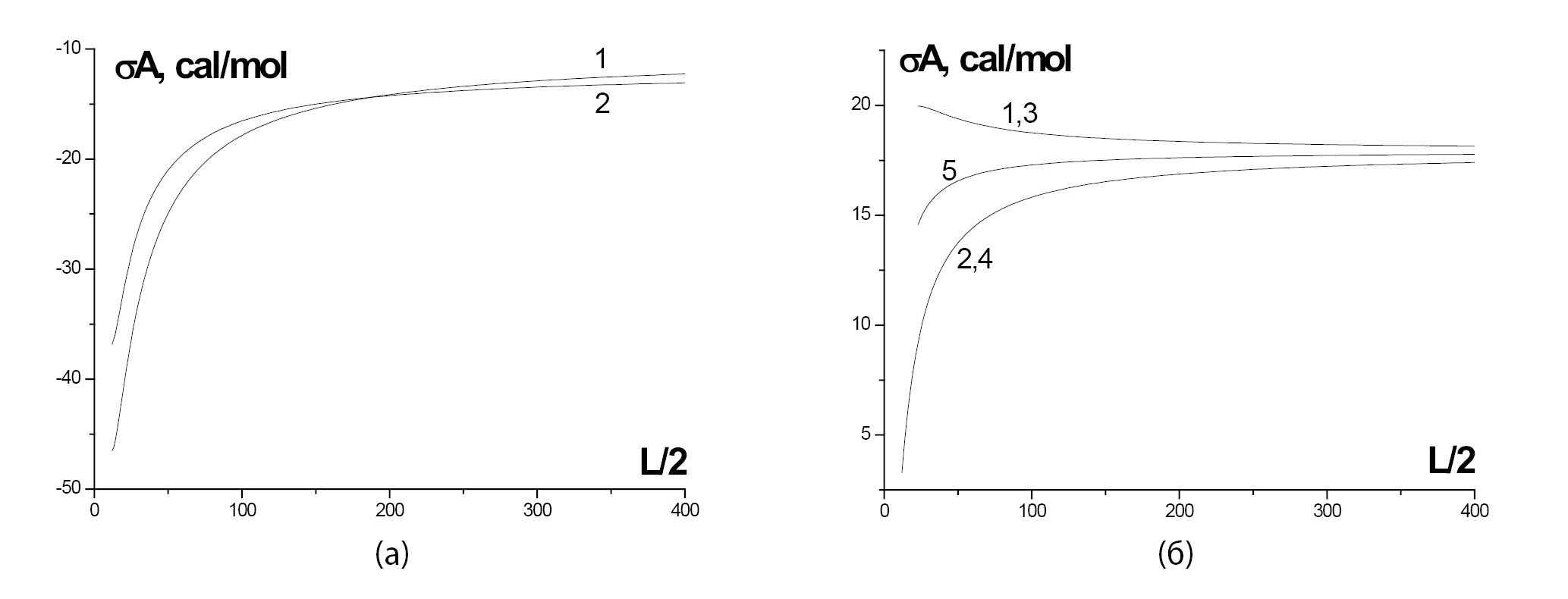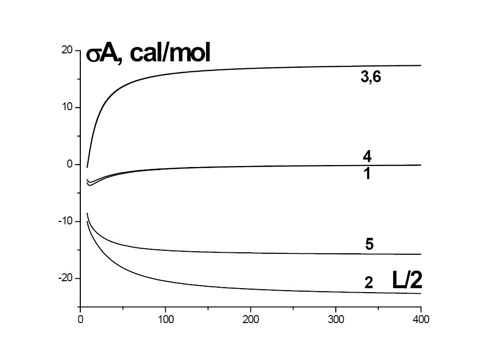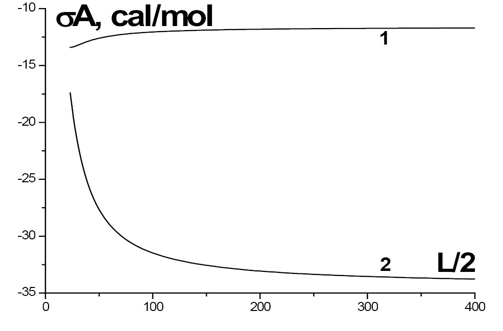ПН на ребре, чей избыток отнесен к грани, (1) убывает с уменьшением стороны куба. ПН в вершине, чей избыток отнесен к ребру, (2) увеличивается с уменьшением стороны куба. Два разных поведения кривых связано с наличием двух факторов, влияющих на ход кривых. Первый фактор связан со сближением ПН в различных областях с уменьшением размера L (см. рис. 7), т.е. разница ПН между разными областями убывает. Второй фактор связан с тем, что в выражениях (10б–в) вклады химпотенциалов от разных областей взвешиваются на одни и те же весовые функции только от одной из областей: в (10б) – это весовые функции области ребра, а в (10в) – области вершин. Таким образом, второй фактор может нарушать результат первого фактора. В областях ребер и вершин весовые функции меняются подобным образом в переходной области, поэтому второй фактор не искажает результата первого фактора и кривая 2 дает уменьшение рассматриваемой функции по модулю с уменьшением L. В области граней же характер весовых функций отличается: все монослои переходной области имеют равные веса. И в результате того, что химпотенциалы в области граней в (10б) взвешиваются на веса ребер, мы имеем отличный результат для кривой 1: рассматриваемая функция увеличивается по модулю с уменьшением L.