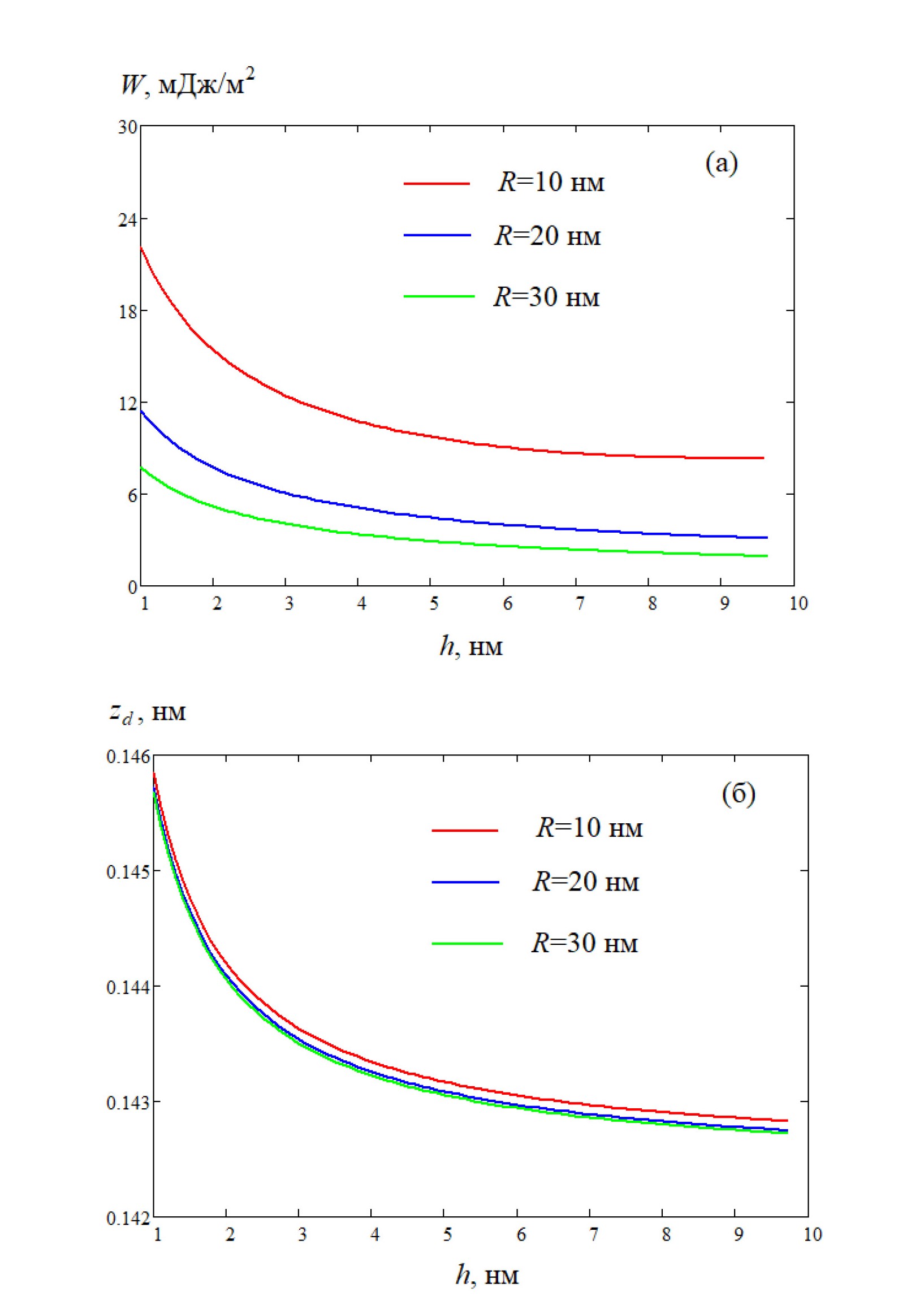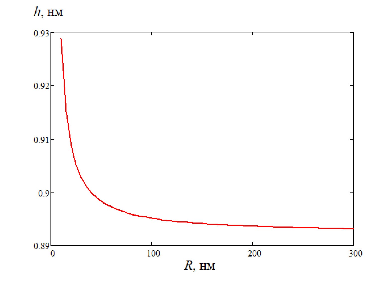где – сила притяжения капли к подложке при , рассчитываемая из (6) путем дифференцирования дисперсионной составляющей по переменной z. Правая часть неравенства (10) в некотором смысле аналогична расклинивающему давлению, которое подробно анализировал в своих работах Б.В. Дерягин (см., например, [16, с. 30–35]). Сходство заключается в том, что рассматриваемое давление возникает из-за сил межатомного взаимодействия и является избыточным по отношению к внешнему атмосферному давлению. Решая неравенство (10), определяем область допустимых значений высоты капли. При заданном R из (10) вычисляется предельное значение h, меньше которого для капли быть не может.