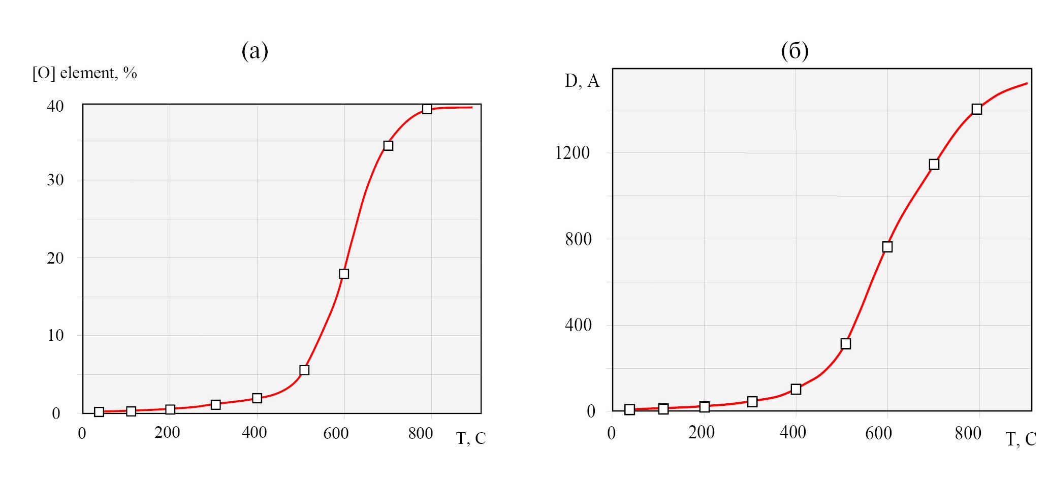 Рис. 3. а – рассчитанное по данным энергодисперсионного анализа изменение среднего содержания кислорода в термооксидном слое с температурой оксидирования T; б - рассчитанное изменение усредненной по микроучастку поверхности толщины D термооксидного слоя с температурой T за 1 ч. оксидирования.