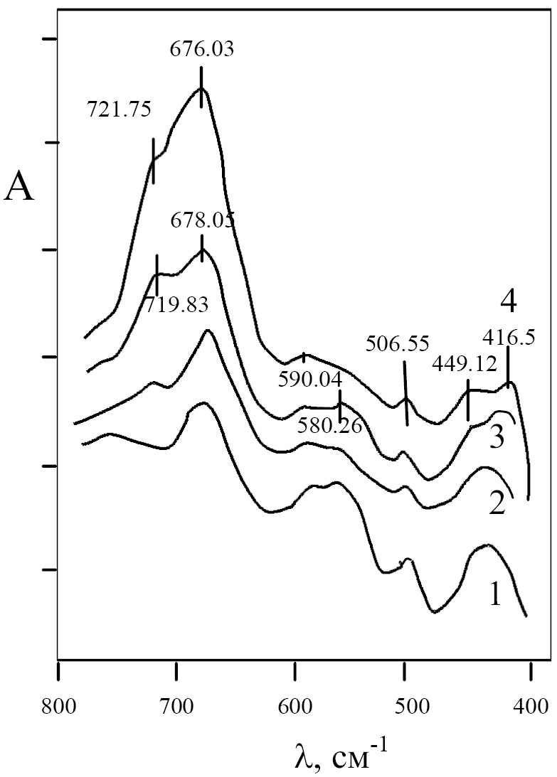 Рис. 4. ИК-спектры стальной пластины, окисленной за 1 ч при различных температурах: 1 – 400°С, 2 – 500°С, 3 – 600°С, 4 – 700°С