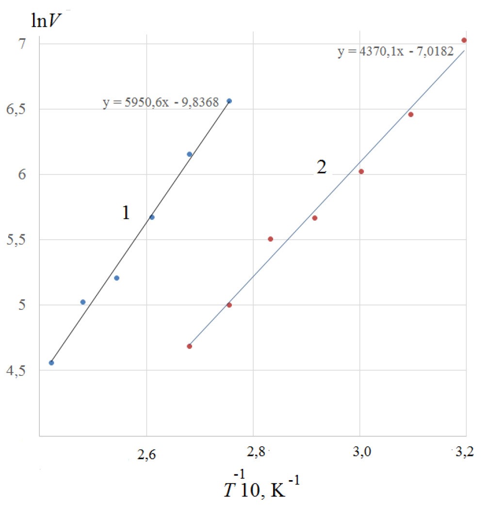 Представляло интерес определить qmax при максимальной концентрации воды и гептана в газовой фазе, т.е. при максимально возможных в опытах q. На рис. 4 представлены данные по зависимости приведенного удельного объема V воды и гептана от температуры в координатах lnV от 1/Т. Опытные данные (точки) в указанных координатах, в согласии с теорией, группируются вдоль прямых. Это позволило из тангенса угла наклона прямых вычислить qmax. Они оказались равными –36,3 для воды и –49,5 кДж/моль для гептана.