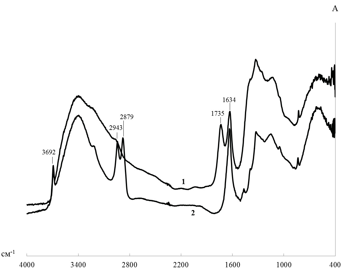 Спектр Фурье-ИК, полученный в режиме диффузного отражения, приведен на рис. 5. В случае исходного образца НА наблюдается сигнал характеристических колебаний карбонильной группы (1735 см–1), который полностью исчезает при проведении восстановительного гидрирования. Необходимо отметить рост сигнала гидроксильных групп (1634 см–1) при модифицировании НА в данных условиях, что может указывать на превращение карбонильных групп в гидроксильные. Также в спектре модифицированного образца НА проявляется четкая полоса поглощения изолированных О–Н связей (3692 см–1) и отсутствовавшие ранее сигналы колебаний С–Н связей (2943 и 2879 см–1).