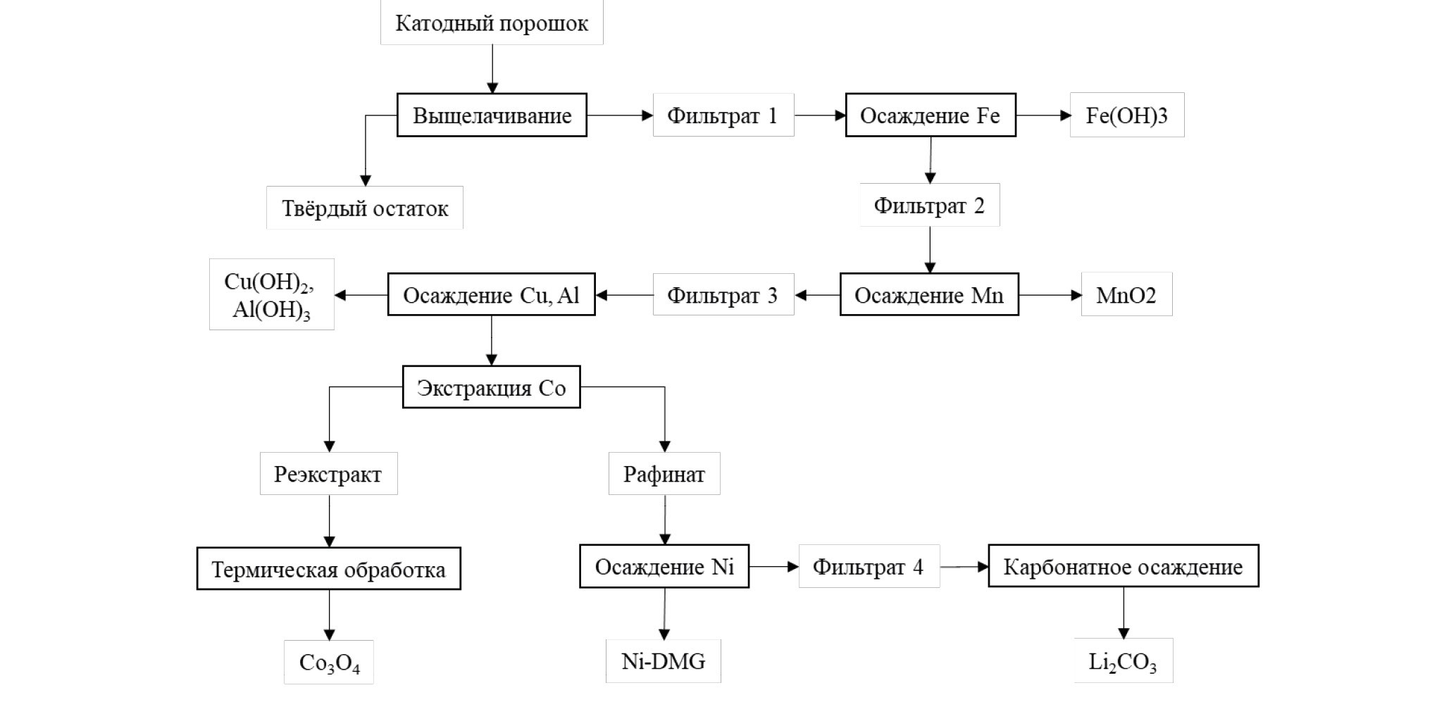 В работе [42] был изучен экстрагент на основе ионной жидкости “Cyphos IL 102”, который, как оказалось, хорошо извлекает Fe(III), Cu(II), Co(II), в меньшей степени Fe(II) и Mn(II), при этом практически не извлекает Ni(II) и Li. В связи с этим была предложена технологическая схема (рис 4). На первом этапе из продуктов выщелачивания катодного порошка проводилось последовательное осаждение гидроксида Fe(II), MnO2, гидроксидов меди и алюминия. На втором этапе осуществлялась экстракция Co(II) с помощью 0,05 M раствора “Cyphos IL 102” в толуоле, с получением смешанного оксида кобальта после термической обработки реэкстракта при 600°C. На третьем этапе из рафината после экстракции кобальта осаждался диметилглиоксимат никеля (II). На финальном этапе проводилось карбонатное осаждение лития.