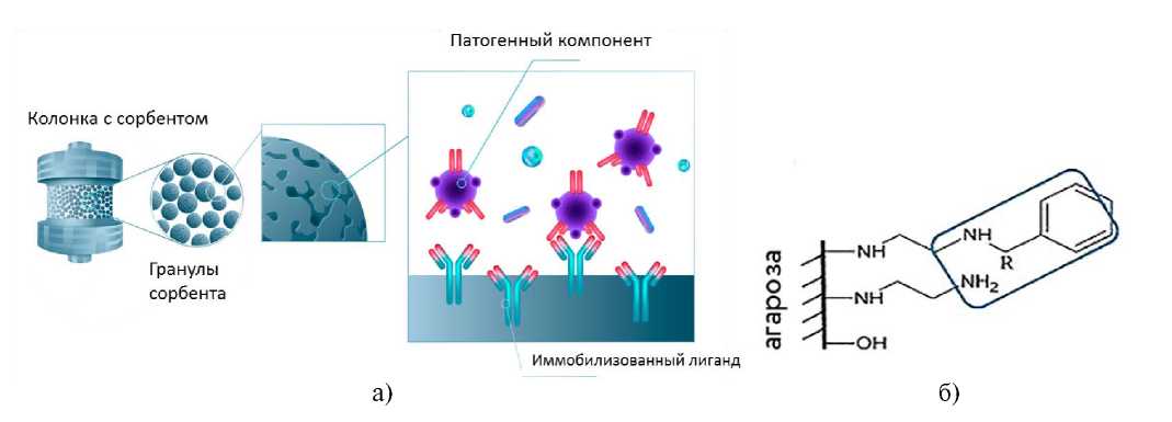 Биологические аффинные лиганды относятся к биомолекулам с хорошей селективностью и высокой биосовместимостью, они представляют собой белки, пептиды, аминокислоты и некоторые другие биомиметические молекулы. Обычно взаимодействие биологических лигандов включает несколько видов межмолекулярных сил. Примеры биологических лигандов для лечения конкретных заболеваний: полимиксин B для связывания эндотоксина при лечении сепсиса и белок A для связывания токсина сибирской язвы. Физико-химические аффинные лиганды относятся к синтетическим лигандам с хорошей стабильностью и низкой стоимостью (полиакрилонитрил, полиэтиленимин и т.д.). Они демонстрируют хорошую устойчивость к биологическому разложению и могут быть легко иммобилизованы для создания адсорбентов с высокоселективным сродством к комплементарным молекулам. Физико-химические аффинные лиганды связываются посредством электростатических и гидрофобных взаимодействий. Когда размеры лигандов или токсичных молекул большие, становятся необходимыми спейсеры (в переводе с английского “spacer” означает прокладку, разделитель, заполнитель). Спейсеры могут уменьшить стерические препятствия между лигандами и токсичными молекулами, что приводит к увеличению адсорбционной способности сорбента [23].