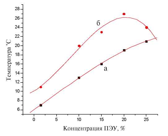 Диаграммы фазового состояния в квазибинарных системах получали методом точек помутнения [8] в диапазоне температур от 5°С до 30°С и составов от 2% до 25% ПЭУ (рис. 1). При этом содержание воды в растворах приближено к тем концентрациям, при которых растворы начинают мутнеть (опалесцировать) в результате начала процесса фазового распада. Для растворителя (а) – это 5%, для растворителя (б) – 7%. Фазовую структуру пленок исследовали методом одноступенчатых углеродно-платиновых реплик с помощью трансмиссионного электронного микроскопа ЕМ-301 Philips (рис. 2).