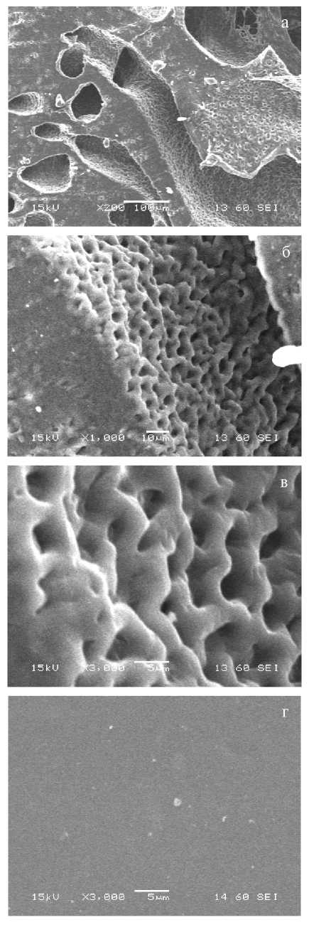 Рис. 2. Фазовая структура пленок полученных из раствора, содержащего в качестве компонента растворителя морфолин (a, б, в) и мочевину (г)