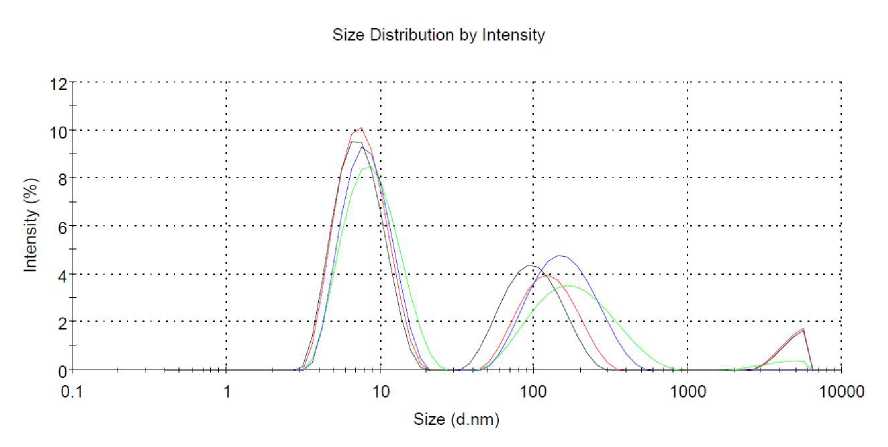 Размер рассеивающих свет наночастиц ПЭУ исследовали методом динамического рассеяния света на приборе Malvern Zetasizer Nano-ZS, поверенном на стандартном полистирольном латексе в кварцевых и акриловых кюветах. Растворы полимеров перед измерением фильтровали через политетрафторэтиленовый фильтр (насадка на шприц) с размером пор 0,45 мкм.