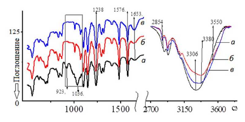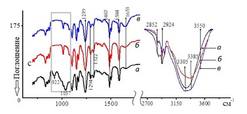 Рис. 3. Копии ИК-НПВО спектров образцов УФ ПЭС мембраны в 2-х спектральных областях от 500 см–1 до 1750 см–1 и от 2750 см–1 до 3750 см–1 (образцы: а – воздушносухой (нерабочий), б – водонасыщенный, в – рабочий)