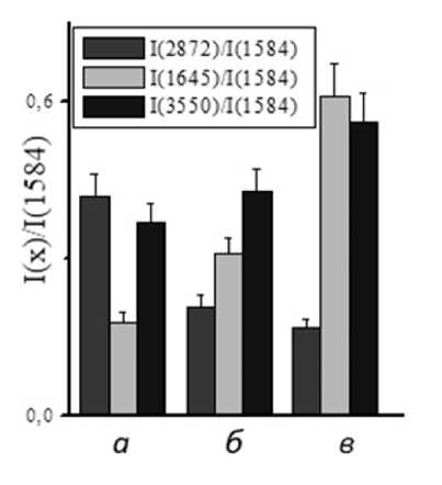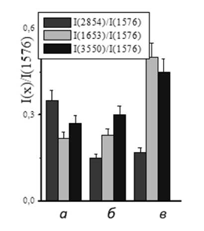 Рис. 2. Диаграмма приведенных пиковых интенсивностей полос поглощения при 2853 см–1, 1645 см–1, 3550 см–1 для образцов УФ ПС мембраны (образцы: а – воздушносухой (нерабочий), б – водонасыщенный, в – рабочий)