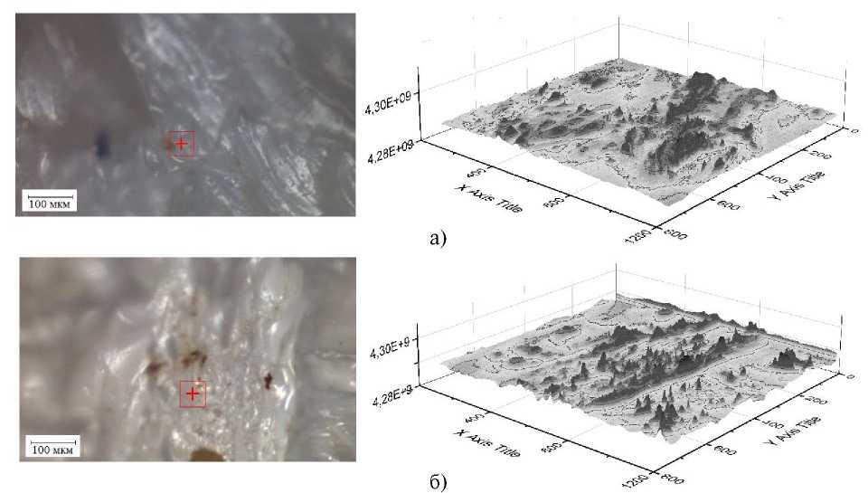Кроме этого представлялось важным оценить состояние активного слоя ПС и ПЭС мембран. На рис. 5 а,б, 6 а,б представлены микрофотографии подложки исследуемых мембран, увеличенных в 100 раз, их воздушносухих и рабочих образцов, а также трехмерные графики подложки, выполненные в программе OriginPRO. После анализа оптических изображений и трехмерных графиков образцов ультрафильтрационных мембран ПС и ПЭС, полученных до и после действия трансмембранного давления, было отмечено изменение в их морфологии, в частности уплотнение волокон у рабочих образцов мембран. Вследствие этого можно предположить, что структурная перестройка макромолекул подложки ПС и ПЭС мембран влияет на конформацию макромолекул активного слоя, то есть происходит перераспределение соотношения аморфных и кристаллических сегментов мембран [26].