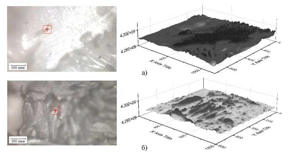 Рис. 5. Микрофотография и трехмерный график полимерного дренажного слоя мембраны из полисульфона: а – сухой образец; б – рабочий образец
