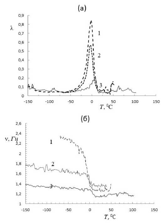 На рис. 1 (а, б) представлены температурные зависимости спектров внутреннего трения λ (а) и частоты затухающего колебательного процесса ν (б), возбуждаемого во всех трех исследованных высокоэластичных сополимерах.