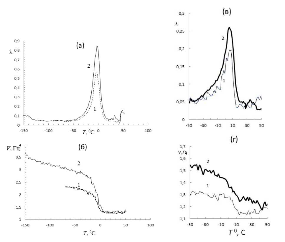 Рис. 2. Диссипативные процессы и частота колебаний в пленках А15 (а, б) и А315 (в, г): кривые 1 – без модификатора; кривые 2 – с модификатором