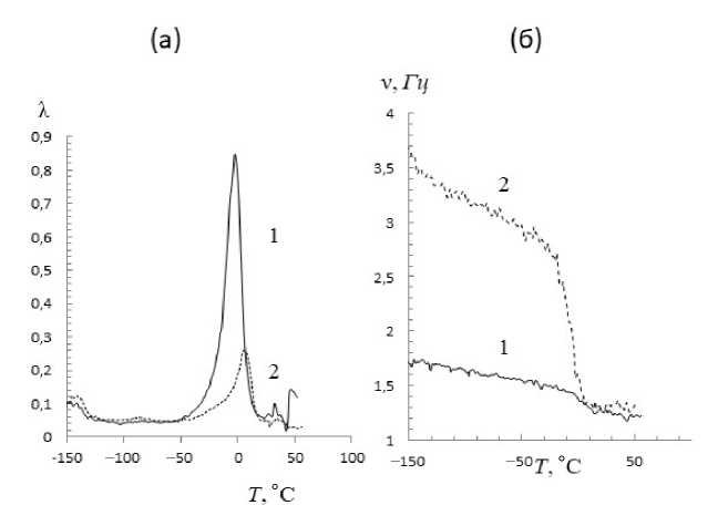 Рис. 3. Температурные зависимости спектров внутреннего трения λ (а) и частоты затухающего колебательного процесса ν (б), возбуждаемого в модифицированных полимерах А15 (кривая 1) и А315 (кривая 2)