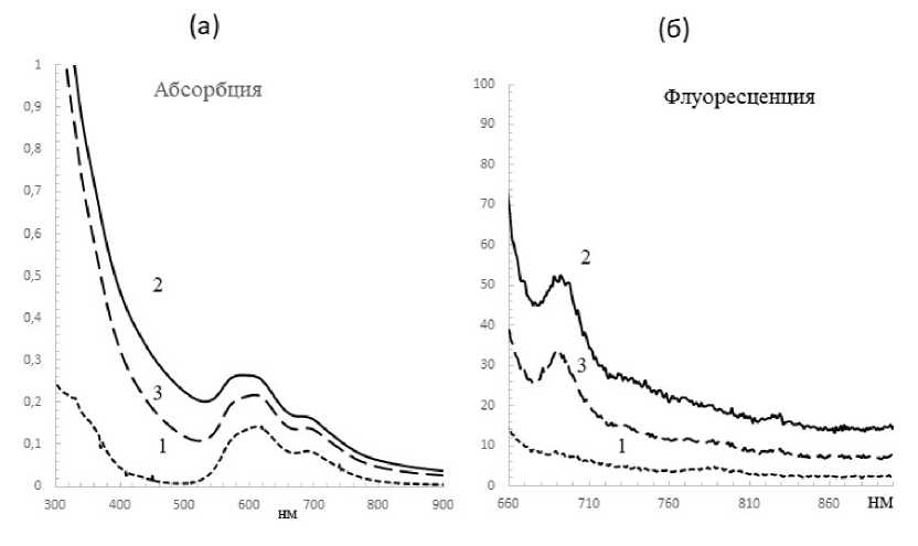 Рис. 4. Спектры абсорбции (а) и флуоресценции (б): фталоцианина (1) и модифицированных полимеров А15 (2) и А25 (3)