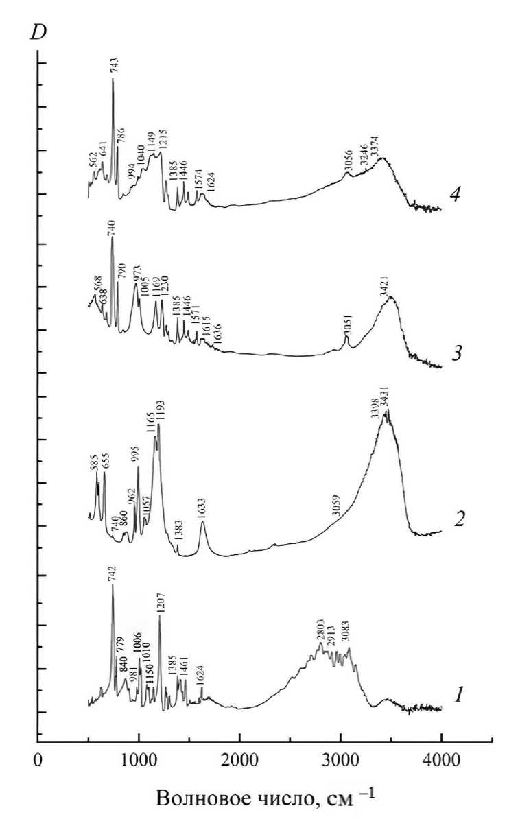 ИК-спектры регистрировали на ИК-Фурье-спектрометре Infralum ФТ-801 с рабочим диапазоном волновых чисел 550–5500 см–1. Перед измерением исследуемые образцы диспергировали в порошке KBr (ч.д.а., АО “Ленреактив”, Россия) в соотношении 1:4 и прессовали в таблетки.