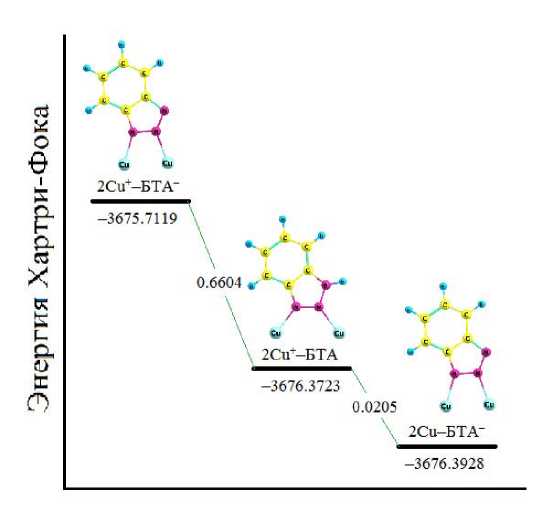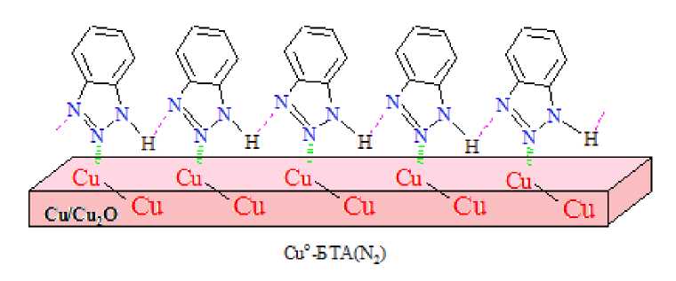Как отмечают авторы работы [95], ингибирующий эффект бензотриазола обусловлен следующими факторами: БТА химически связывается с поверхностными атомами меди и препятствует их переходу в раствор; создает защитную пассивную пленку на поверхности меди, что предотвращает ее коррозию с участием атмосферного кислорода и воды.