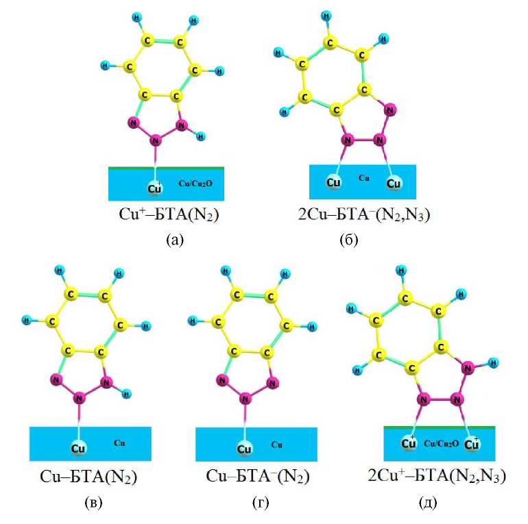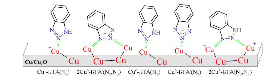 Рядом авторов [78, 79] показано, что комплекс БТА–Cu(I) как адсорбированный на поверхности меди, так и полученный в виде монокристалла, нестабилен на воздухе и начинает окисляться до БТА–Cu(II). Однако по данным работы [80] в течение длительного времени в растворе с рН < 7 на поверхности меди образовывался только комплекс БТА–Cu(I). На основе анализа РФЭС было высказано предположение, что в образование этого поверхностного комплекса могут быть вовлечены молекулы кислорода и воды.